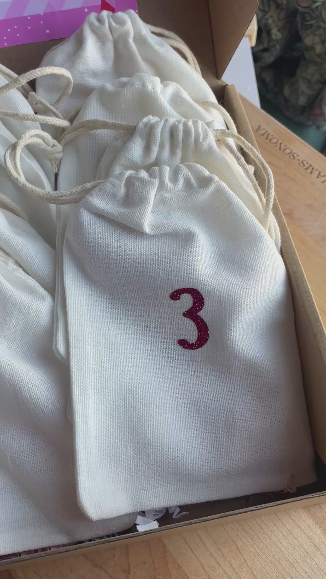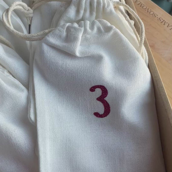 Each bookmark individually inside of a mini drawstring pouch for you to open each day.
