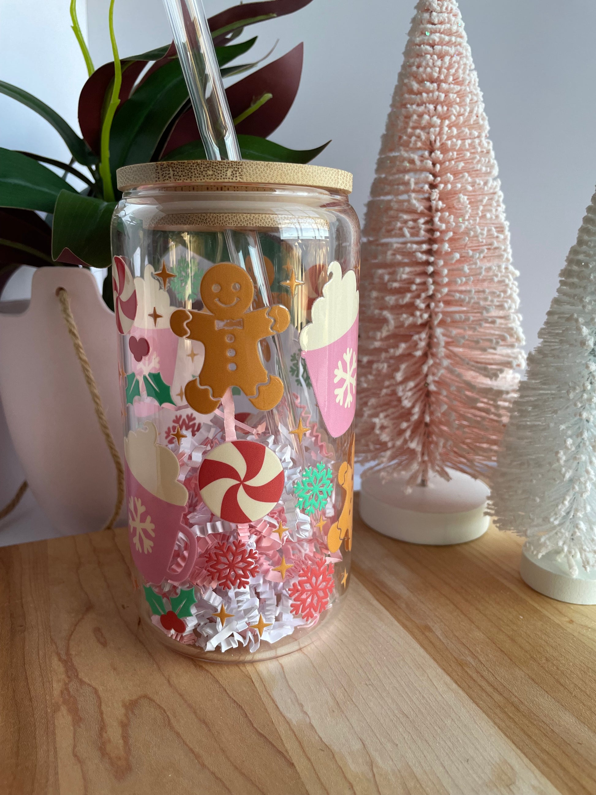 Colorful Cookies and Cocoa Glass Cup with Bamboo Lid and Glass Straw