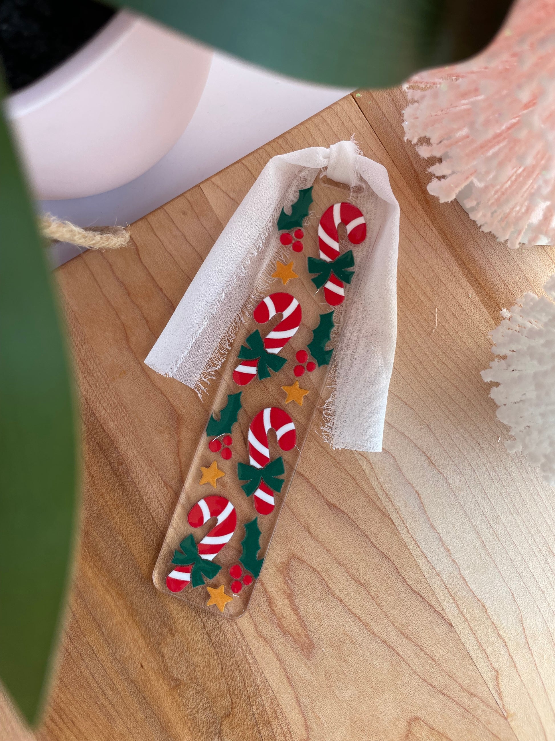 Festive Candy Canes Clear Acrylic Bookmark with Chiffon Ribbon
